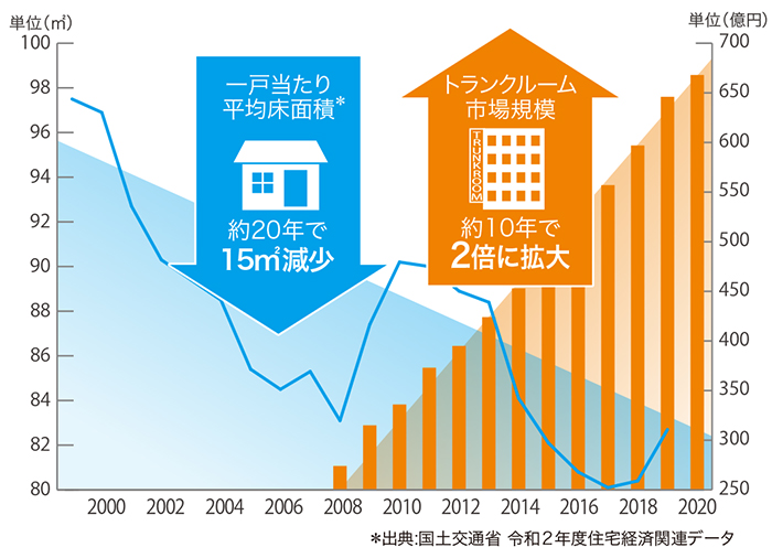 約20年前に比べ1戸あたりの居住面積が15㎡以上も減少※1しています。住宅の狭小化が進んだ事で、都心部を中心とした良質なトランクルームの需要は不透明な経済情勢下においても力強く、新たな生活様式に即した多様なニーズも生まれつつあり、今後も大きな成長が見込まれています。