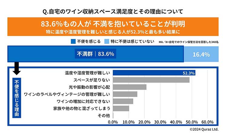 また、自宅のワインスペースへの満足度を問うと、83.6%ものワイン愛好家が、自宅の保管スペースに不満を抱いていることが判明。特に温度や湿度管理を難しいと感じる人が52.3%と最も多い結果でした。