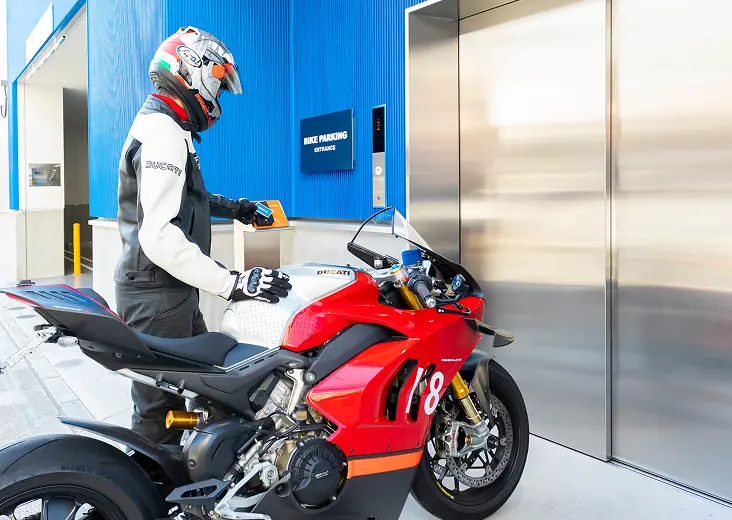 キュラーズのバイクパーキングは一から設計し、全スペース幅900mm以上を確保。広々とした空間で雨風・日よけはもちろん、空調も完備しているので大切なバイクを清潔に保管できます。