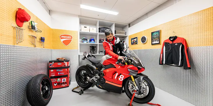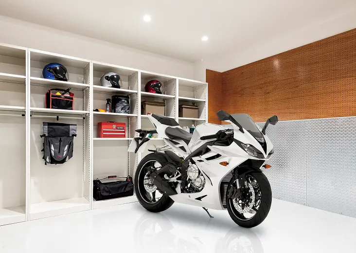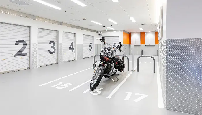 ガレージタイプのバイクパーキングには、電源コンセント・有孔ボード・収納棚・ロッカーなどが設置されており、簡易的な作業は可能です。ただし、基本的には保管専用スペースのため、整備や洗車などの作業は制限される場合があります。