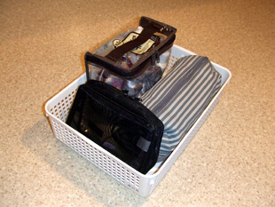 When you group your things by application—such as cleaning goods, hair care sets, make up sets, and the like—or by user, you will improve efficiency and ease of use.