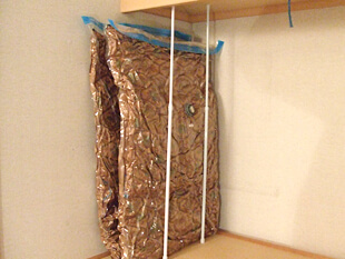 圧縮した布団はデッドスペースに立てて収納すると空間を有効活用できる。立てた場合は突っ張り棒などで、抑えてあげると、倒れてこないのでGOOD。
