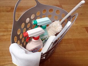 お掃除セット ソファの脇など、いつも座るところの近くに、コロコロやハンディモップなど、カンタンなお掃除グッズを用意すると、気が付いた時に気軽にお掃除できて便利。テレビを見ながら…など「ながら掃除」がキレイをラクに維持するコツです。取っ手付きのカゴに入れておけば、持ち歩けるのでさらに便利。