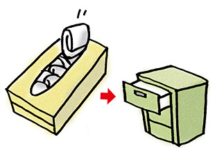 スーパーのビニール袋は、ゴミ袋として活用する方がほとんどでしょうが、収納はみなさんどうしていますか? どうせゴミとして出すのだからといって、引出しにぐちゃぐちゃに入っているならぜひこのアイデアを実践してみてください。 まず、使用済のティッシュボックスをリサイクルします。ティッシュの取出し口に、スーパーのビニール袋をくるくるっと丸めて並べるように順に入れていきます。それを引出しに入れておけば見た目もきれいだし、何より取り出しやすくなります。こうすれば、バラバラにならずにスッキリ片付きますよ。 あっ!そのティッシュ箱、捨てないで!