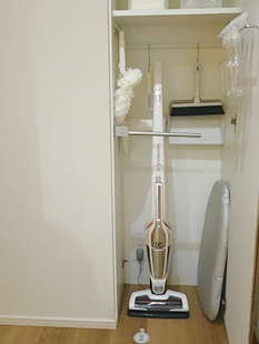 最近のマンションの廊下収納は、意外に奥行きがあります。手前と奥と入れるものを分けて収納しましょう。収納量が2倍になるだけでなく、よく使うモノを手前に置くことで、より取り出しがスムーズになります。 棚板も取り外しできたり、高さを細かく調整出来たり、奥行きが半分のサイズのもの(奥だけ棚収納にできる)などいろいろあるので、我が家の掃除機のサイズに合わせて、下半分を長いモノを収納できるように調節しましょう。 例えば、手前には長さのある掃除機を収納し、奥にはクイックルワイパーやハンディモップなどの小さい掃除グッズを掛ける収納に。