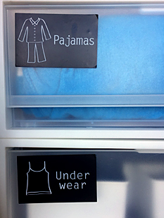 服を出しっぱなしにしてしまうお子さんのクローゼットには、イラストでアイテムがついている大き目なラベルシールを貼ります。視覚に訴えることで、そこにしまうのが自然になり、いつのまにかお片付けができるようになるのです。